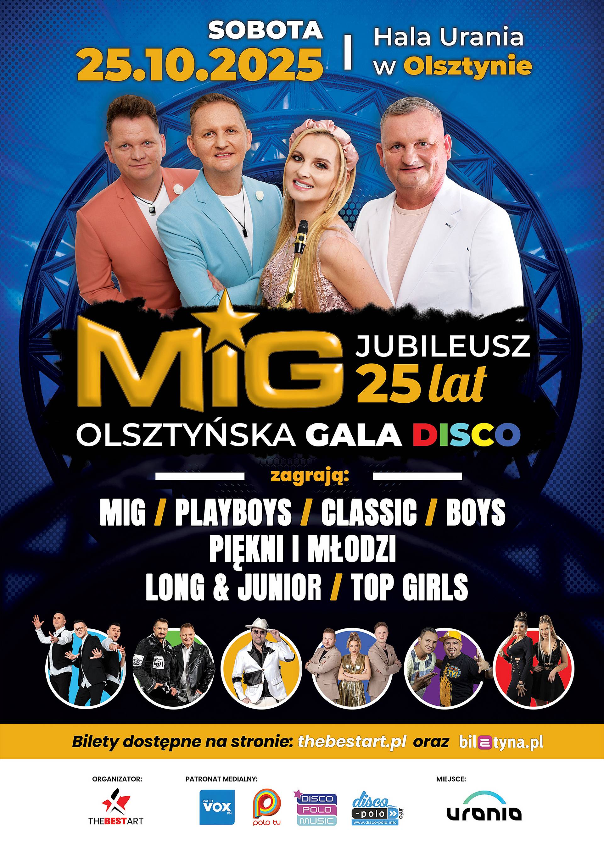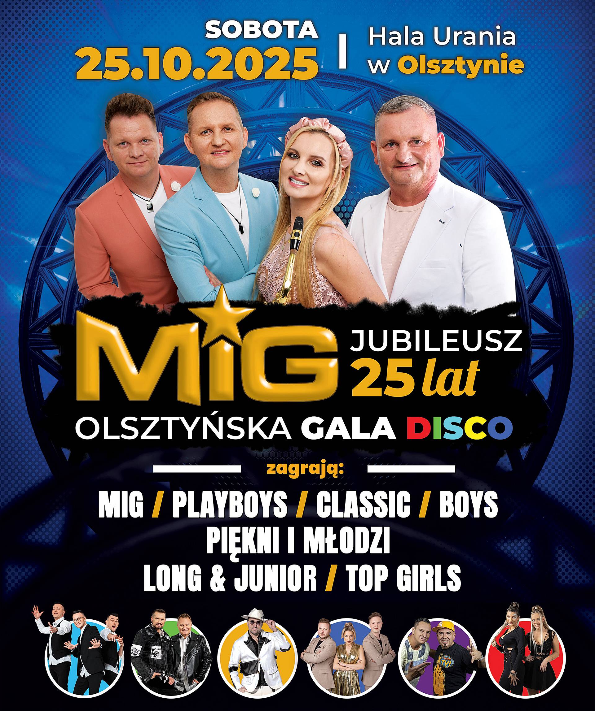 Największa taneczna impreza w Olsztynie nadchodzi! Olsztyńska Gala Disco 2025 to wieczór, podczas którego publiczność świętować będzie 25-lecie zespołu MIG, jednej z najbardziej kultowych formacji disco w Polsce.
